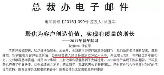 2016年12月30日,华为轮值CEO徐直军宣布,2016年销售收入达到5200亿人民币,同比增长32%。